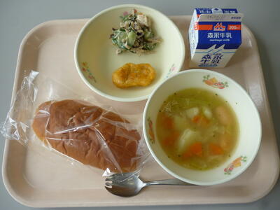 今日のメニューは、ミルクパン、牛乳、ポトフ、大豆のナゲット、ごぼうサラダです。ポトフはフランスの家庭料理で、大きめに切った野菜や肉などをスープで煮込んだ料理です。給食のポトフにはウインナーが入っています。今日も美味しくいただきましょう。