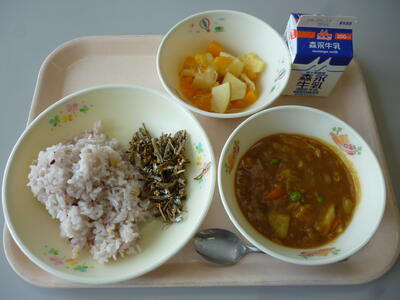 今日のメニューは、雑穀ごはん、牛乳、春野菜のカレー、いりこの酢だき、フルーツあえです。今日は月に1回のお誕生日献立の日です。みんなが大好きなメニューを準備しました。4月生まれのお友達をみんなでお祝いし、美味しくいただきましょう。