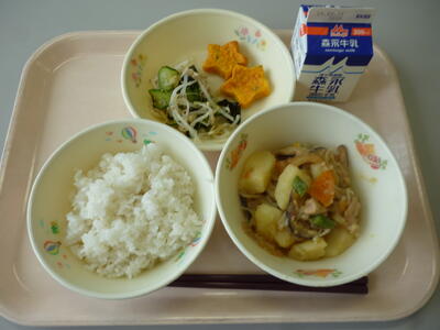 今日のメニューは、 麦ごはん、牛乳、肉じゃが、豆腐のしんじょ、わかめのあえものです。今日はまめ、ごま、わかめ、やさい、さかな、しいたけ、いもの頭文字をとった、「まごわやさしい」献立の日です。どんな食材が使われているかな?今日も美味しくいただきましょう。