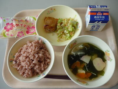 今日のメニューは、赤飯、牛乳、ふのすまし汁、鶏肉の香り焼き、サラたまあえ、お祝いクレープです。今日は、入学や進級を祝って「お祝い献立」です。昔からお祝いの席で食べられてきた赤飯とデザートが用意されています。美味しくいただきましょう。