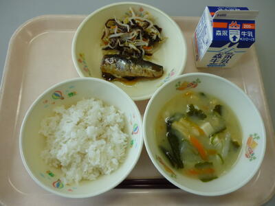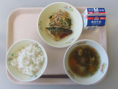 今日のメニューは、雑穀ごはん、牛乳、けんちん汁、さばのみそ煮、わかめのごま酢あえです。今日は「まごわやさしい」食材がそろった献立です。7つの食材(豆類、種類、海藻類、野菜類、魚介類、キノコ類、芋類)を探しながら、美味しくいただきましょう。