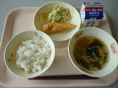 今日のメニューは、麦ごはん、牛乳、わかめスープ、鶏肉のマスタード焼き、春キャベツのサラダです。給食センターの調理機材の不具合により、鶏の唐揚げが鶏肉のマスタード焼きに変更されています。食物アレルギー等に変更はないようです。今日も美味しくいただきましょう。