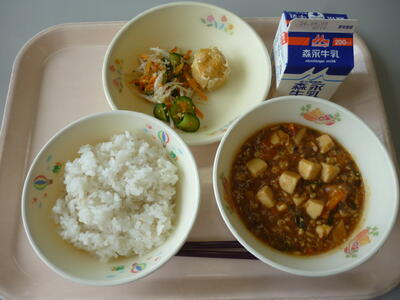 今日のメニューは、麦ごはん、牛乳、マーボー豆腐、にんじんシューマイ、もやしのナムルです。マーボー豆腐は、 ひき肉 と 赤とうがらし、トウバンジャンなどを炒め、 鶏がら スープで煮た四川料理の定番です。給食では、甘めの味付けになっています。今日も美味しくいただきましょう。