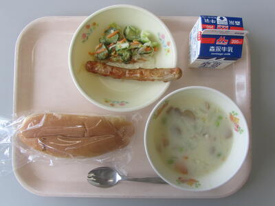 今日のメニューは、たてわりコッペパン、牛乳、豆乳クリーム煮、ウィンナーのケチャップソース、コールスローサラダです。今日は、コッペパンにウインナーとサラダをはさんで、セルフドッグです。美味しくいただきましょう。