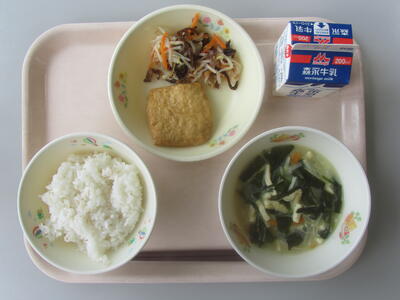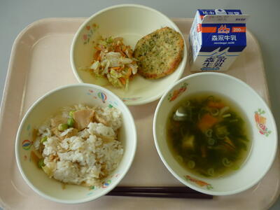 今日のメニューは、たけのこごはん、牛乳、あおさ汁、大豆と豆腐のかわり焼き、おかかあえです。タケノコは春に美味しい食べ物です。煮物や和え物、吸い物などいろいろな料理で美味しくいただけます。今日はタケノコごはんを美味しくいただきましょう。