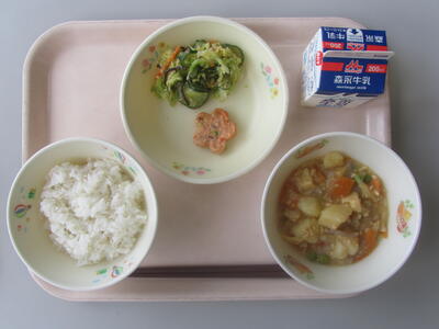 今日のメニューは、 麦ごはん、牛乳、チキンカレー、青のりマヨいりこ、キャベツとパインのサラダです。カレーライスは食べやすいため、よくかまずに早く食べてしまいがちです。そこで、今日はかみかみメニュー「青のりマヨいりこ」がついています。よく噛んで、美味しくいただきましょう。