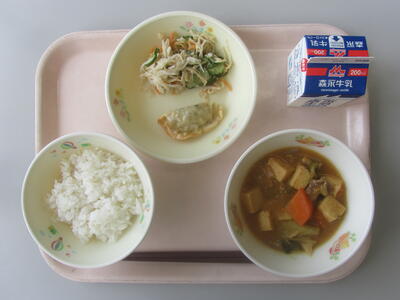 今日のメニューは、麦ごはん、牛乳、ジャージャン豆腐、肥後ぎょうざ、切干大根の中華あえです。ジャージャン豆腐は、中国の四川料理の一つで、揚げた豆腐を肉や野菜と一緒に炒めた料理のことです。漢字で「家常豆腐」と表し、家でよく食べる豆腐料理という意味があります。美味しくいただきましょう。