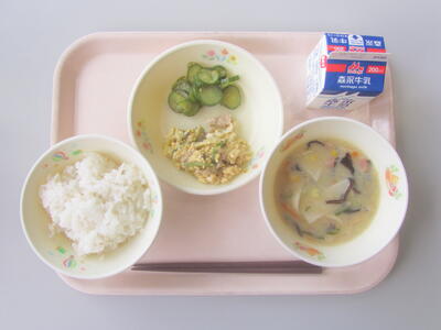 今日のメニューは、キムタクごはん、きのこ汁、大豆と豆腐の変わり焼き、いかの酢の物です。今月の味の旅は長野県です。子どもたちに人気のメニュー「キムタクごはん」は、もとは長野県の塩尻市西部中学校の栄養士が、子どもたちに漬物を美味しく食べてもらいたいと考案した料理だそうです。今日も残さずいただきましょう。