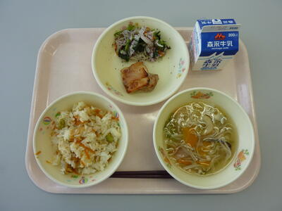 今日は八十八夜。立春から数えて88日目を「八十八夜」というそうです。春と夏の変わり目で、稲の種まき準備や茶摘みのシーズンになります。季節感のある献立、旬の食材がたっぷりの美味しい給食でした。