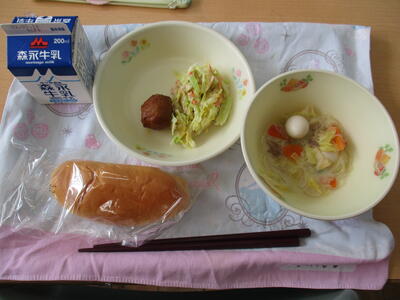 「ラビオリスープ」「高野豆腐のチリソースいため」「茎わかめのサラダ」「米粉入りにんじんパン」でした。
