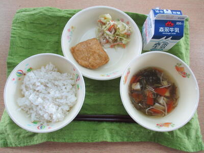 「もずく汁」「信田煮」「ごぼうのマヨ和え」「麦ごはん」でした。