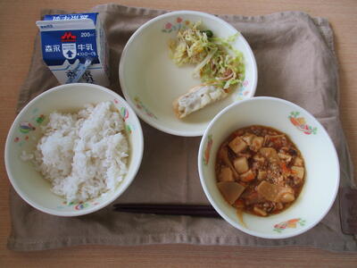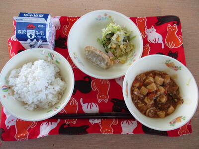 「マーボーどうふ」「焼きぎょうざ」「中華風コーンサラダ」「麦ごはん」でした。