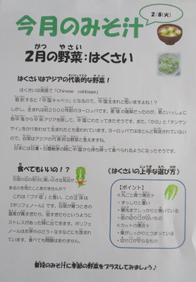 季節野菜をたっぷり使った「今月のみそ汁」の日。今日は冬野菜の代表、大根たっぷりのみそ汁でした。冬野菜は、寒さから身を守るために、凍らないよう糖分を作るのでしたね。だから、冬野菜は甘みがあるのです。ほかほかのみそ汁は、美味しくて体があたたまりましたね。