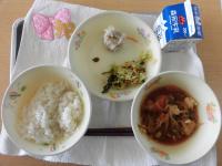 今日のメニューは、麦ごはん、牛乳、トックスープ、大豆と豆腐の変わり焼き、れんこんと茎わかめのきんぴらです。トックスープ(トックッ)は、韓国の伝統的なスープ料理で、もち米で作られた薄切りの餅「トック」を使ったスープです。特に韓国ではお正月に食べる習慣があり、日本のお雑煮にあたる料理です。今日は、韓国のお雑煮・トックスープを美味しくいただきましょう。