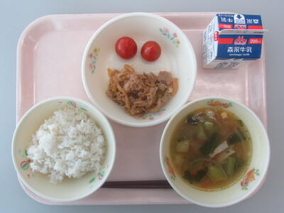 本日のメニューは、麦ごはん、牛乳、チンゲン菜とコーンのスープ、豚キムチ、ミディトマトです。ミディトマトは、大玉トマトとミニトマトの中間にあたる「中玉トマト」のことで、果皮や果肉がしっかりしており、糖度が高く、酸味が少ないのが特徴です。本日は、玉名市野菜振興協議会よりご提供いただいた、大浜産のミディトマトを使用しています。生産者の皆さまに感謝しながら、甘みと旨みの詰まった旬の味わいをおいしくいただきましょう。