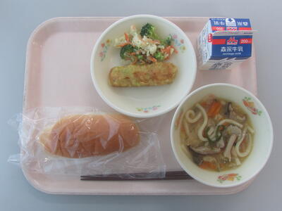 本日のメニューは、ミルクパン、牛乳、難関突破うどん、ちくわの磯辺天ぷら、花野菜サラダです。今年第1回目の給食は、「2026年応援メニュー」として南関あげを使った難関突破うどんです。名前のとおり、さまざまなことに挑戦する一年を応援する思いが込められています。寒さがいっそう厳しくなり、季節はいよいよ「寒」に入りました。今月もしっかり給食を食べて、元気に寒い季節を乗りきりましょう。