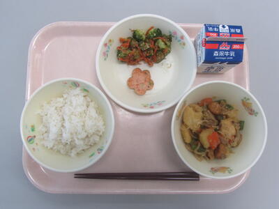 本日のメニューは、麦ごはん、牛乳、肉じゃが、花型しんじょ、ブロッコリーの梅おかかあえです。じゃがいもには「メークイン」と「男爵」などの品種があります。メークインはしっとりとした食感で、煮崩れしにくいのが特徴です。反対に男爵は、ほくほくとした食感が楽しめますが、煮ると形が崩れやすいという特徴があります。今日の肉じゃがには、煮込んでも形が崩れにくいメークインが使われています。じゃがいもの食感の違いも味わいながら、美味しくいただきましょう