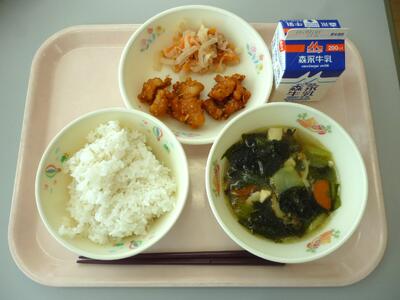 今日のメニューは、麦ごはん、牛乳、わかめスープ、ヤンニョムチキン、大根とツナのサラダです。主菜の「ヤンニョムチキン」は、鶏のから揚げに、コチュジャンやニンニクなどの薬味や香辛料を合わせた、甘辛い特製ダレ(ヤンニョム)をたっぷり絡めた韓国風のフライドチキンです。ピリッとした辛さの中にコクと甘みがあり、ごはんが進む味付けが特徴です。今日は初登場のメニューをよく味わっていただきましょう。