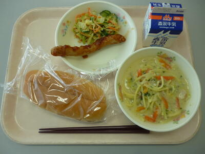 本日のメニューは、たてわりコッペパン、牛乳、豆乳クリームスパゲティ、ウィンナーのケチャップソース、ごまドレサラダです。大豆は「畑の肉」と呼ばれるほど、良質なたんぱく質を豊富に含む食材で、鶏むね肉に匹敵するほどのたんぱく質量があります。さらに、ビタミンやミネラル、食物繊維、イソフラボンなどの機能性成分も多く含まれており、健康の維持や美容、骨や血管の健康をサポートしてくれます。今日は、大豆から作られた豆乳クリームを使ったスパゲティです。まろやかでやさしい味わいを、ぜひおいしくいただきましょう。