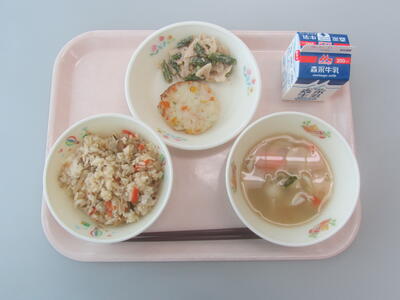 今日のメニューは、びりん飯、牛乳、白玉汁、道産野菜のふっくら寄せ、れんこんといんげんの和え物です。今月の「ふるさとくまさんデー」では、宇城地区の郷土料理「びりん飯」を紹介します。びりん飯は、三角町戸馳島に伝わる精進料理で、肉の代わりに豆腐を使った混ぜご飯です。豆腐を油で炒めるときに「びりん、びりん」と音がすることから、この名前が付いたと言われています。昔から地域で親しまれてきた、素朴でやさしい味わいの郷土料理です。ふるさとの食文化に思いをはせながら、今日も美味しくいただきましょう。