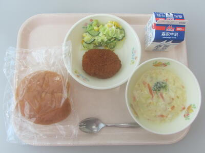 本日のメニューは、カット丸パン、牛乳、白菜のクリーム煮、コロッケ、キャベツとコーンのサラダです。白菜は、キャベツや大根と同じアブラナ科に属する野菜で、冬を代表する食材のひとつです。7世紀頃に中国から日本へ伝わり、現在では冬の食卓に欠かせない野菜として親しまれています。寒さが増すほど甘みが強くなるのが特徴で、栄養も豊富です。今日は、旬を迎えて甘みが増した白菜を、まろやかなクリーム煮でおいしくいただきましょう。