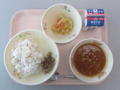 本日のメニューは、麦ごはん、牛乳、ミートボールカレー、カムカムいりこ、甘夏サラダです。みなさんは、食事のときに何回くらい噛んで食べていますか。よく噛んで食べることは、脳の発達や味覚の向上につながるほか、食べすぎを防いだり、病気の予防につながったりするなど、体にとって多くのよい働きがあると言われています。今日は、よく噛むことを意識できるように「カムカムいりこ」が出ました。よく噛んで、味わって食べることを心がけていきましょう。
