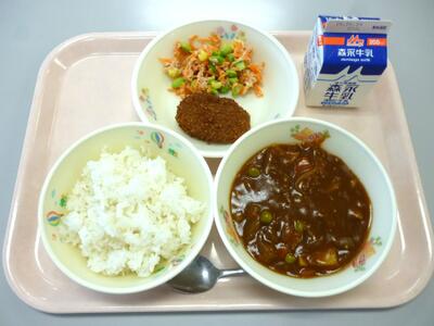 今日のメニューは、麦ごはん、牛乳、ハヤシシチュー、国産キャベツのメンチカツ、にんじんサラダです。ハヤシシチューは、薄切りの牛肉と玉ねぎをデミグラスソースやトマトソースでじっくり煮込み、ご飯にかけて食べる、日本発祥の洋食です。明治時代に「早矢仕(はやし)」さんという人物が考案したことが名前の由来といわれています。コクのあるハヤシシチューに、国産キャベツを使ったメンチカツ、さっぱりとしたにんじんサラダを組み合わせ、栄養のバランスにも配慮した献立となっています。今日は、今年最後の給食です。毎日の給食の時間を振り返りながら、感謝の気持ちをもって、楽しく味わっていただきましょう。