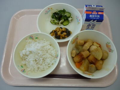 「お月見汁」「さといもコロッケ」「切干大根のはりはり漬け」「麦ごはん」「お月見ゼリー」でした。