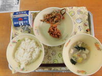 今日のメニューは、麦ごはん、牛乳、トックスープ、大豆と豆腐の変わり焼き、れんこんと茎わかめのきんぴらです。トックスープ(トックッ)は、韓国の伝統的なスープ料理で、もち米で作られた薄切りの餅「トック」を使ったスープです。特に韓国ではお正月に食べる習慣があり、日本のお雑煮にあたる料理です。今日は、韓国のお雑煮・トックスープを美味しくいただきましょう。