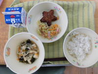 麦ごはん、牛乳、白菜のみそ汁、ささみのレモン漬け、大豆の磯煮です。今月の季節野菜の味噌汁は、「白菜」です。白菜は冬を代表する野菜で、今が一番おいしい旬の時期です。寒さが厳しくなるこの季節、白菜は凍らないように自分の中に糖分をためこみます。そのため、冬の白菜は甘みが増し、やさしい味わいになるのが特長です。また、霜に当たることで繊維が柔らかくなり、煮るとさらにおいしくなると言われています。今日は、そんな旬の白菜をたっぷり使ったみそ汁です。季節の恵みに感謝しながら、体も心も温まる一杯をおいしくいただきましょう。