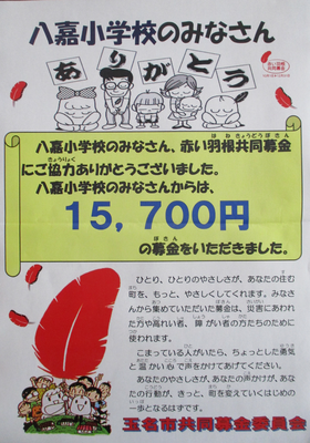 企画委員会さんが中心になって呼びかけてくれた赤い羽根共同募金では、多くのご協力をいただきありがとうございました。お礼のポスターが届きましたので、校内に掲示をして子どもたちに知らせたところです。みなさんの善意が社会を明るく照らします。