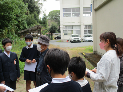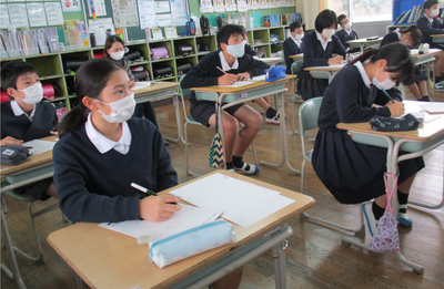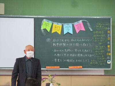 修学旅行を前に、戦争や平和について学んでいる6年生たち。今日は、大倉にお住まいの谷口さんから戦争体験について語っていただきました。谷口さんが6年生の頃は戦争が激しく勉強どころではなかったこと、父親に召集令状が届いたとき母親の手が震えていたこと、呆然とした表情、毎晩泣いていたことを今でも忘れられないと涙を浮かべ声を詰まらせながら話してくださいました。学校敷地内の防空壕あとを前にして、当時の様子も聞かせていただきました。代表でお礼の言葉を述べた人が「自分はこれまでに調べ学習等をして、戦争について知っているつもりになっていたけれど・・・」と、谷口さんから直接話を聴かせてもらったことで気づいたことを率直に述べていました。私も祖母から戦争体験を聴くたびに、その恐ろしさを実感した記憶があります。生の声に触れる貴重な学びができました。ぜひ、ご家庭でも機会をとらえて、こうしたことも話題にしていただければと思います。