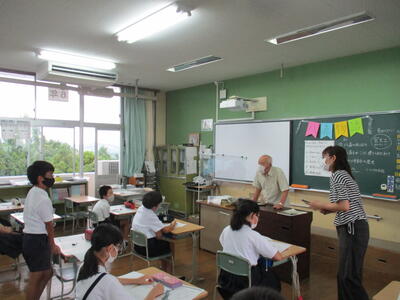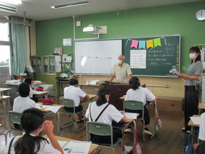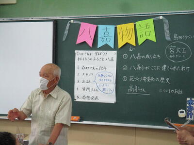まちづくり委員長で郷土歴史研究家の谷口さんをお迎えして、八嘉の成り立ちや八嘉小がこの場所に建てられた理由、花づくり委員会の歴史を中心に話をしていただきました。明治になって、大倉村、向都留村、寺田村、青野村、田崎村、北坂門田村、中坂門田村、南坂門田村が合併し、八嘉村となったこと。八嘉という名には、8つの村が仲睦まじく未来に向けて発展することを願ってつけられたことなど、詳しくお話ししてくださいました。真剣に耳を傾けていた6年生たち。自分たちのふるさとのことを知る貴重な時間でした。未来の八嘉を支える子どもたちの心に、谷口さんの思いも届けていただきました。