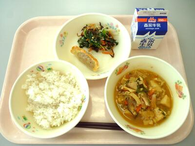 今日のメニューは、コッペパン、かぼちゃの豆乳クリーム煮、ポークチャップ、からいもサラダです。今日はBOOKメニューの第2弾。イギリスの童話「3びきのくま」に出てくる「カボチャスープ」を「かぼちゃの豆乳クリーム煮」にアレンジしました。今日も美味しくいただきましょう。