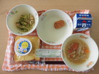 今日のメニューは、麦ごはん、牛乳、トックスープ、大豆と豆腐の変わり焼き、れんこんと茎わかめのきんぴらです。トックスープ(トックッ)は、韓国の伝統的なスープ料理で、もち米で作られた薄切りの餅「トック」を使ったスープです。特に韓国ではお正月に食べる習慣があり、日本のお雑煮にあたる料理です。今日は、韓国のお雑煮・トックスープを美味しくいただきましょう。