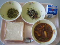 今日のメニューは、麦ごはん、牛乳、トックスープ、大豆と豆腐の変わり焼き、れんこんと茎わかめのきんぴらです。トックスープ(トックッ)は、韓国の伝統的なスープ料理で、もち米で作られた薄切りの餅「トック」を使ったスープです。特に韓国ではお正月に食べる習慣があり、日本のお雑煮にあたる料理です。今日は、韓国のお雑煮・トックスープを美味しくいただきましょう。
