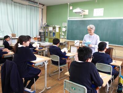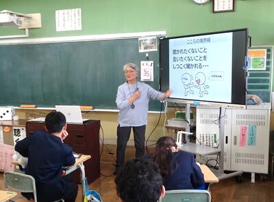 ゆあさいどくまもとの波口様をゲストティーチャーにお迎えし、「こころとからだの安全・安心」と題して、自分の体や心を大切にし、守るために必要なことについて考える学習を行いました。 近年、SNSの普及などを背景に、児童生徒が性被害に遭う事件が増加しており、子どもたち一人一人が自分自身を守る力を身に付けることの重要性が高まっています。授業では、お互いの「こころの境界線」や「性の境界線」を尊重すること、また、嫌なことにははっきりと「NO」と伝えることについて、分かりやすく丁寧にお話しいただきました。子どもたちは、自分のこととして考えながら話を聞き、安心・安全な人間関係について理解を深める姿が見られました。