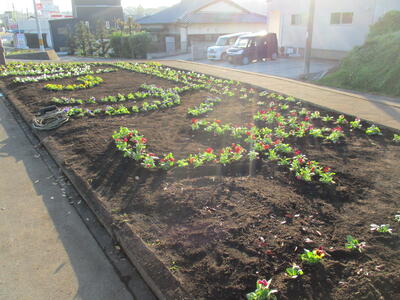 八嘉花づくり委員会のみなさんに教えていただき、種まき、ポットあげの作業をしてきた3年生。大きく育ったパンジーの苗を、国道の花壇に植えました。「八っか子」の文字がきれいに見えます。見事に仕上がりましたね。おめでとう!! これまでのご指導に感謝です。