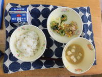 久しぶりの給食です。ペンネとカボチャフライ、桃のコンポートでした。