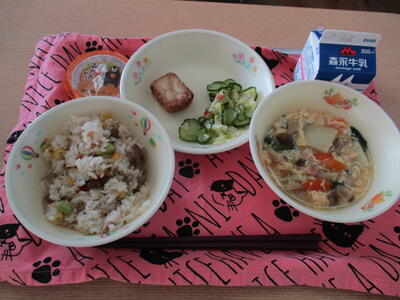 「洋風かきたまスープ」「お魚ナゲット」「イタリアンサラダ」「みかんゼリー」「鶏ごぼうピラフ」でした。