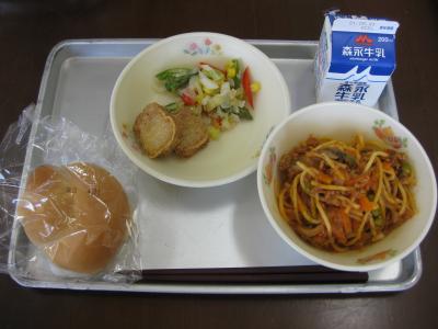 「ミートソーススパゲティ」「お魚ナゲット」「アスパラサラダ」「ひのくにパン」でした。