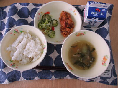 「チンゲンサイとコーンのスープ」「鶏のからあげ」「カラフルサラダ」「麦ごはん」でした。