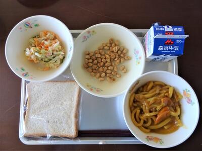 今日のメニューは、食パン、カレーうどん、黒糖ビーンズ、ツナサラダです。黒糖ビーンズは「かむ」ことを意識したメニューです。「かむ」ことの効用を調べると、胃腸の働きを促進する、むし歯・歯周病・口臭を予防する、肥満防止、脳の働きを活発にする、全身の体力向上等々、他にも沢山ありそうです。よく「かんで」食べましょう。