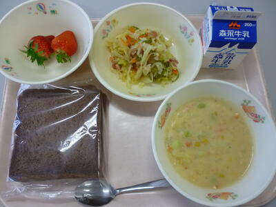 今日のメニューは、ココアパン,ミートボールの豆乳クリーム煮、切り干し大根のソテー、イチゴです。玉名を代表する特産品の「いちご」。いちごはビタミンCを多く含み、疲労やストレスの解消、風邪の予防に効くといわれます。今日のイチゴは、玉名市野菜振興協議会様よりいただいたものです。美味しくいただきましょう。