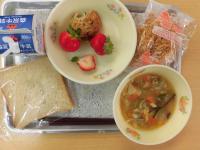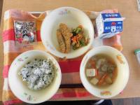 「人参パン・牛乳・わかめうどん・野菜のかき揚げ・れんこんサラダ」