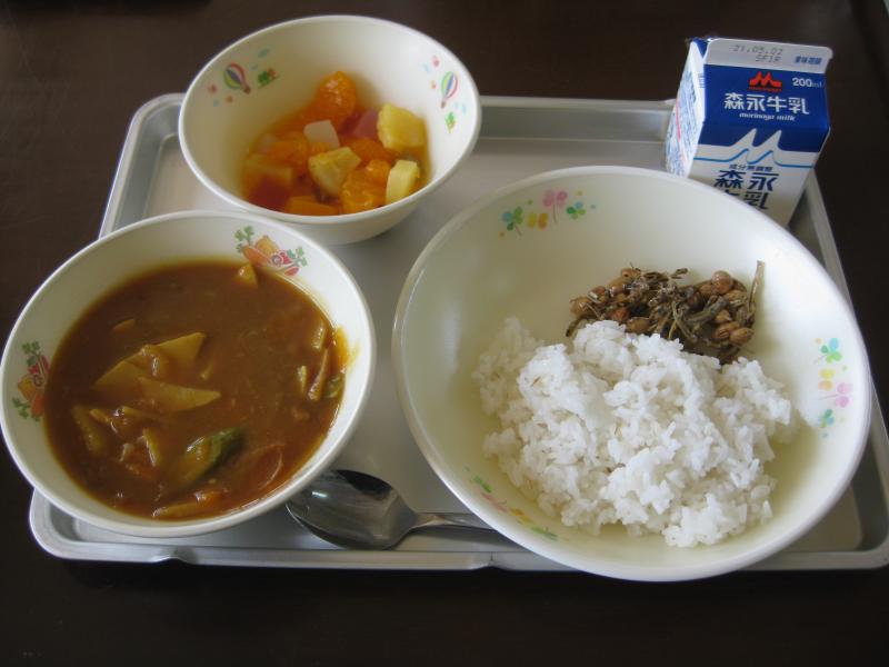 今日は、「春野菜のカレー」「カミカミ大豆」「オレンジポンチ」「麦ごはん」でした。