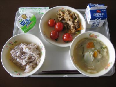 「南関あげのみそ汁」「豚肉の生姜煮」「ミニトマト」「雑穀ご飯」「豆乳ムース」でした。