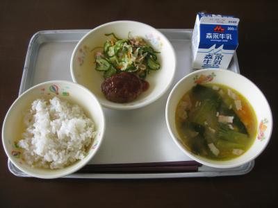 「チンゲンサイのスープ」「ハンバーグケチャップソース」「海藻サラダ」「麦ごはん」でした。