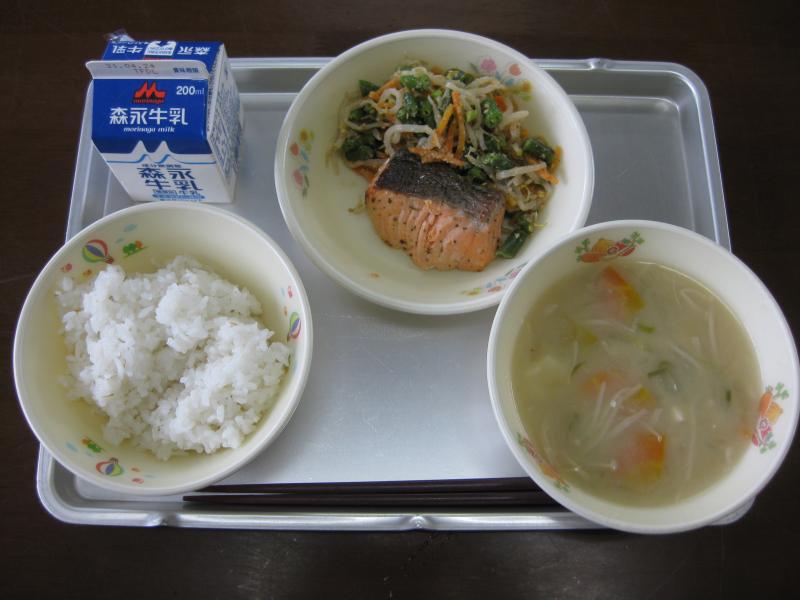 「新たまねぎのみそ汁」「鮭のハーブ焼き」「いんげんのごまあえ」「麦ごはん」でした。