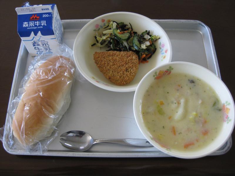 「豆乳クリーム煮」「かぼちゃフライ」「ひじきサラダ」「コッペパン」でした。